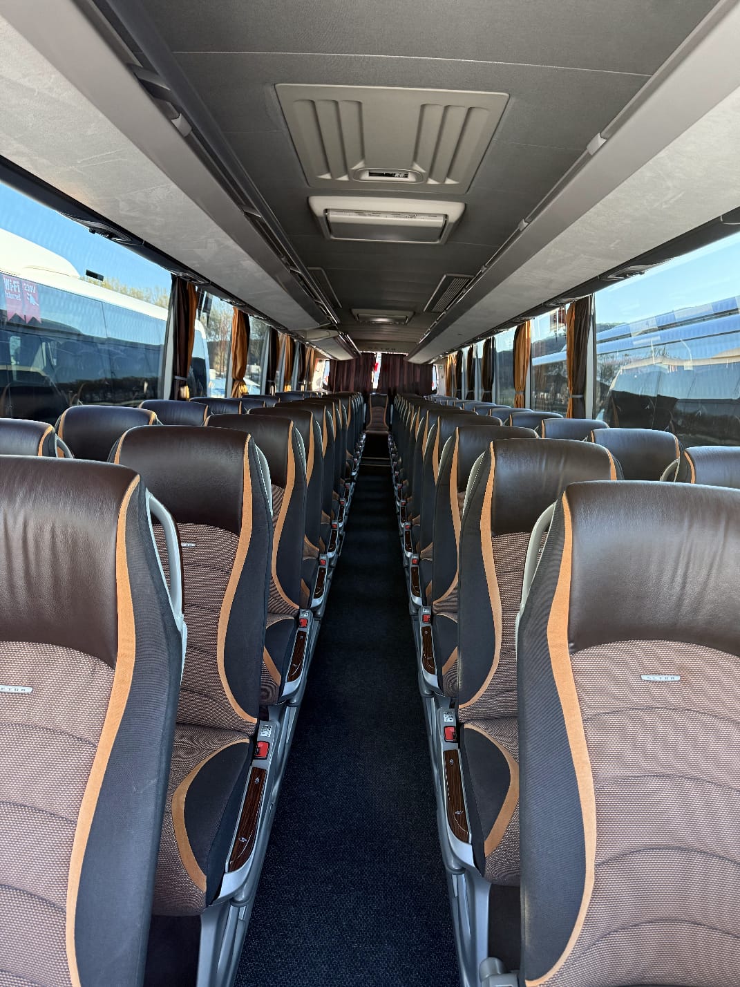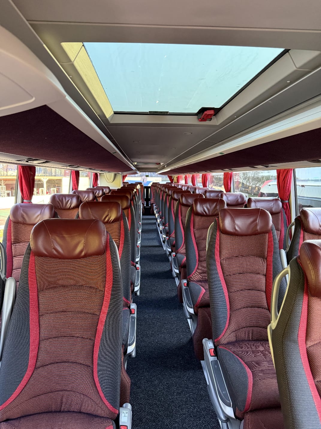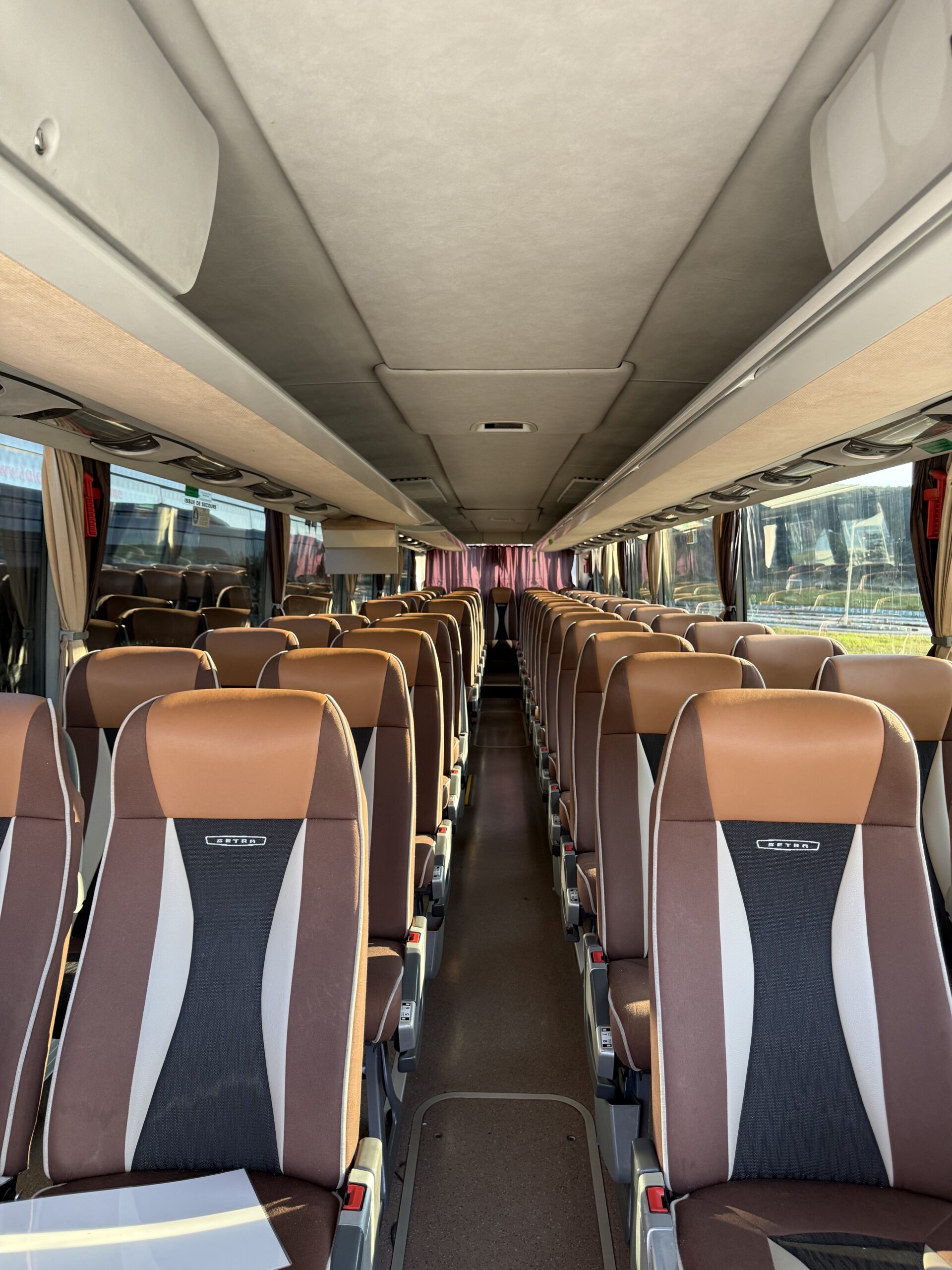 What we offer: Air conditioner, refrigerator, adjustable seats COMFORT CLASS with armrests, footrests, folding table, individual lighting, microphone, safety belts